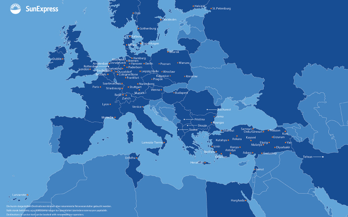- Avrupa ve Kuzey Afrika’da 20’den fazla ülke, 80’den fazla destinasyona uçuş